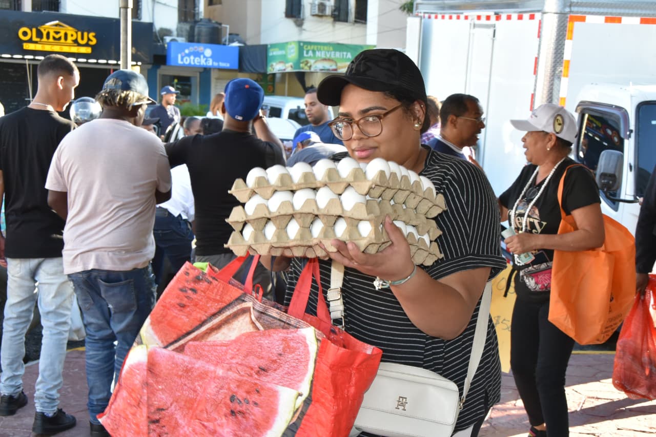 Desde la mañana el sector agropecuario ofertó el cartón de huevos de 30 unidades a 100 pesos, arroz al costo a 20 pesos la libra, habichuela a 50 pesos la funda de una libra, y otros productos a precios de oferta y menores que el costo, como papa a 15 pesos, plátanos a 15 pesos, racimo de guineo a 100 pesos, grandes rebajas en artículos de primera necesidad, como ajo, azúcar y otros.