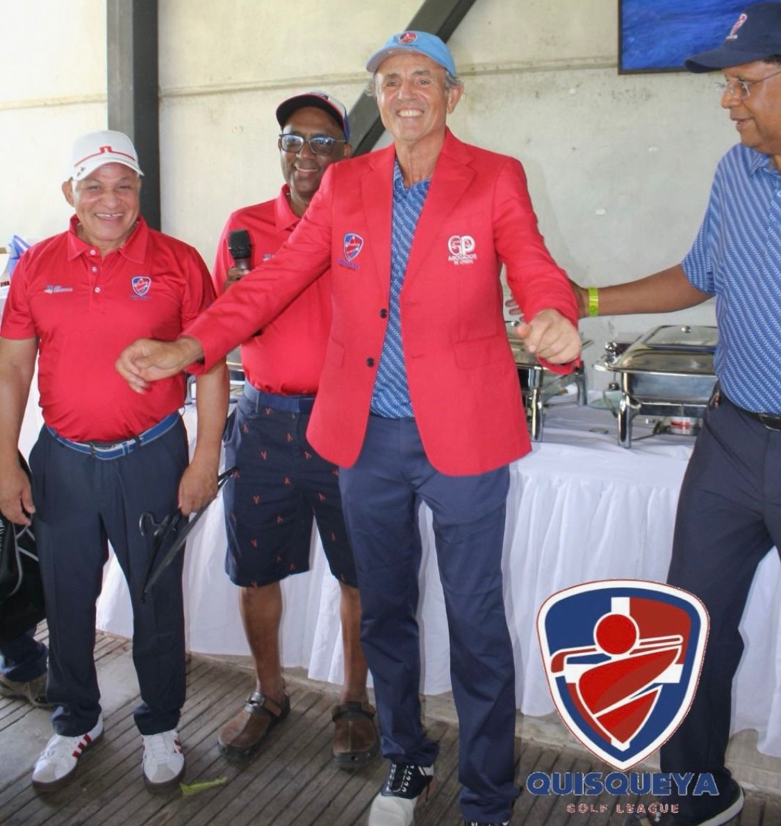 La liga de Golf Quisqueya decidió imprimirle identidad propia: Una chaqueta con uno de los colores de nuestra bandera dominicana, que además es uno de los colores de nuestro Logo, símbolo de orgullo, pertenencia y excelencia.