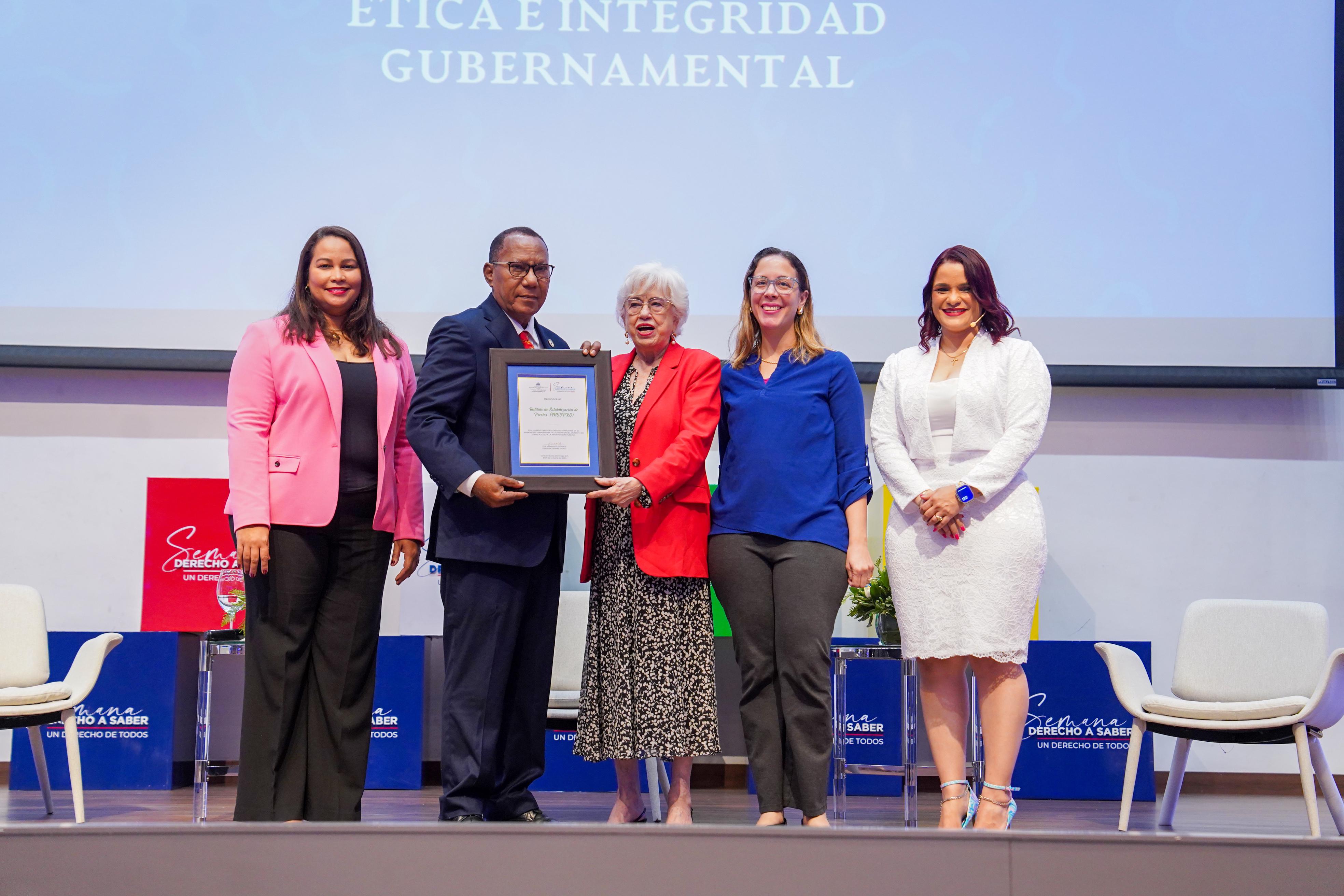 El reconocimiento fue entregado por la directora general de Ética e Integridad Gubernamental, Milagros Ortiz Bosch y fue recibido por el subdirector del Inespre, Obispo de los Santos, en representación del director ejecutivo de la institución, Iván Hernández Guzmán y por la coordinadora ejecutiva de la Comisión de Integridad Gubernamental y Cumplimiento Normativo y encargada de la Oficina de Libre Acceso a la Información, Penélope Columna.